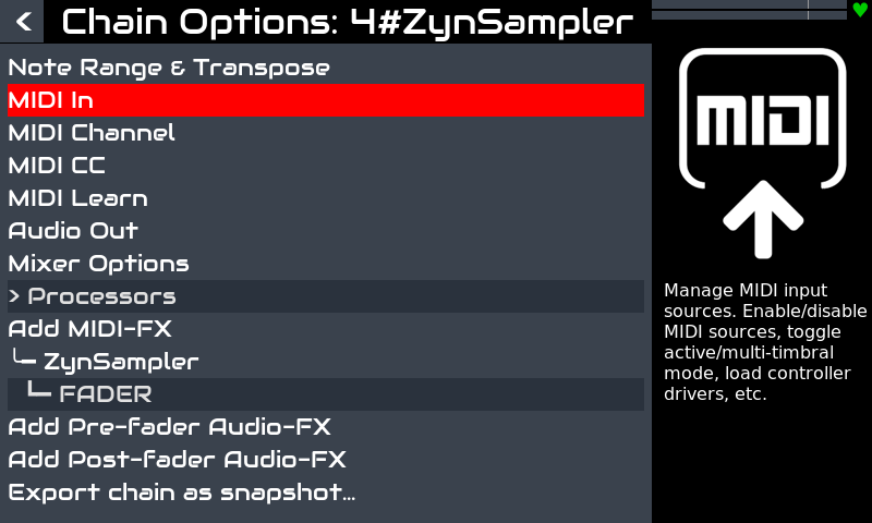 When you get to the options of a chain, by bold-pressing on it in the mixer view, you are showed the Midi In menu, where, again by bold press, you can choose whether the instrument loaded in the same chain responds to whatever incoming Midi channel is sent to the currently selected chain (chain mode aka active mode) or the Zynth functions multitimbrally, as a 16-channel Midi expander.