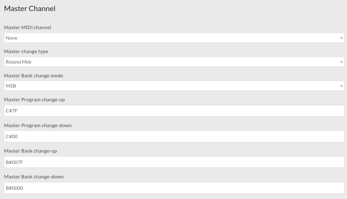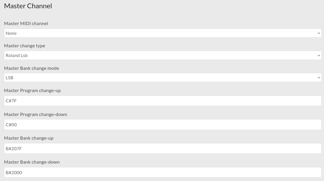 which allow you to configure MIDI commands that can be sent on the master channel to increment and decrement the program (snapshot) and bank (snapshot bank).