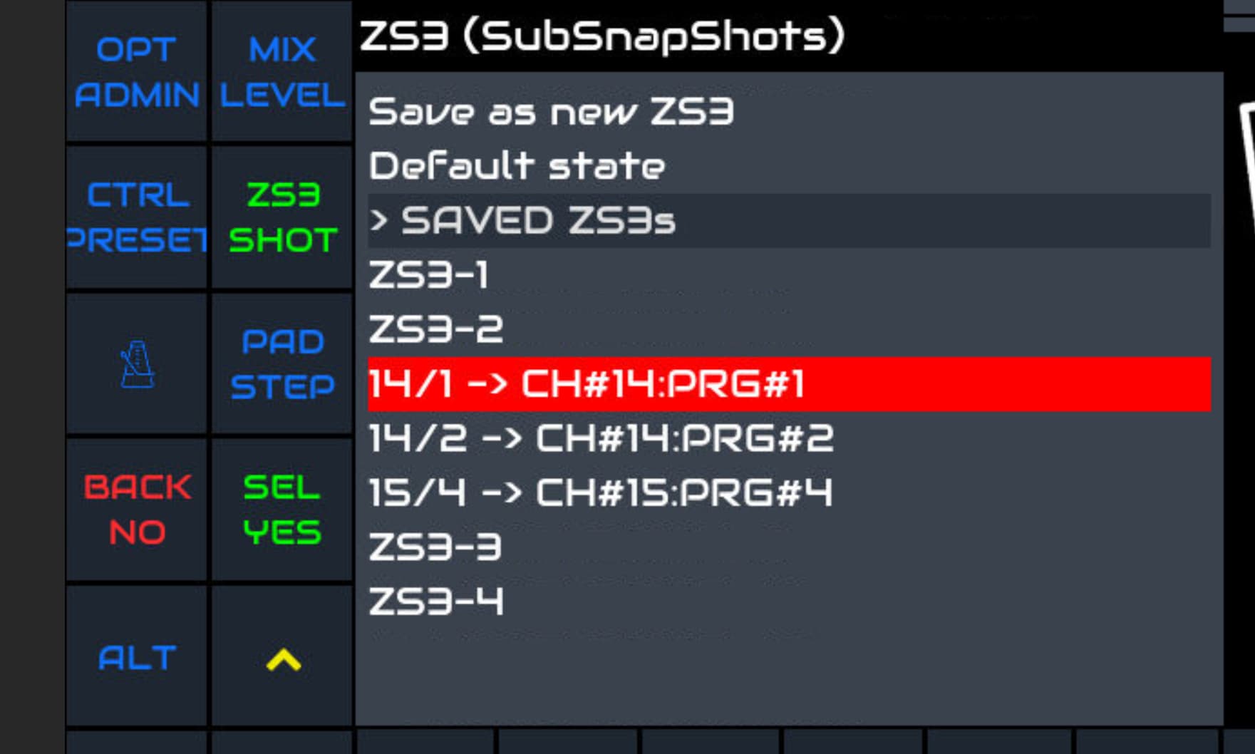 So when you have 5 ZS3 subsnapshots numbered from 001 to 005. You can select then individually by any channel and PC that is received when a ZS3 subsnapshot name is selectedon the ZS3 user screen. It does not matter to which MIDI channel is defined for the Snapshot itself.