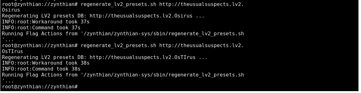After that I rebooted, searched for engines and presets, rebooted, started from an empty snapshot, instantiated Osirus and OsTIrus (with no presets shown on the Z GUI), checked them on VNC (presets available), erased all chains, rebooted again, created two new chains with the two synths.