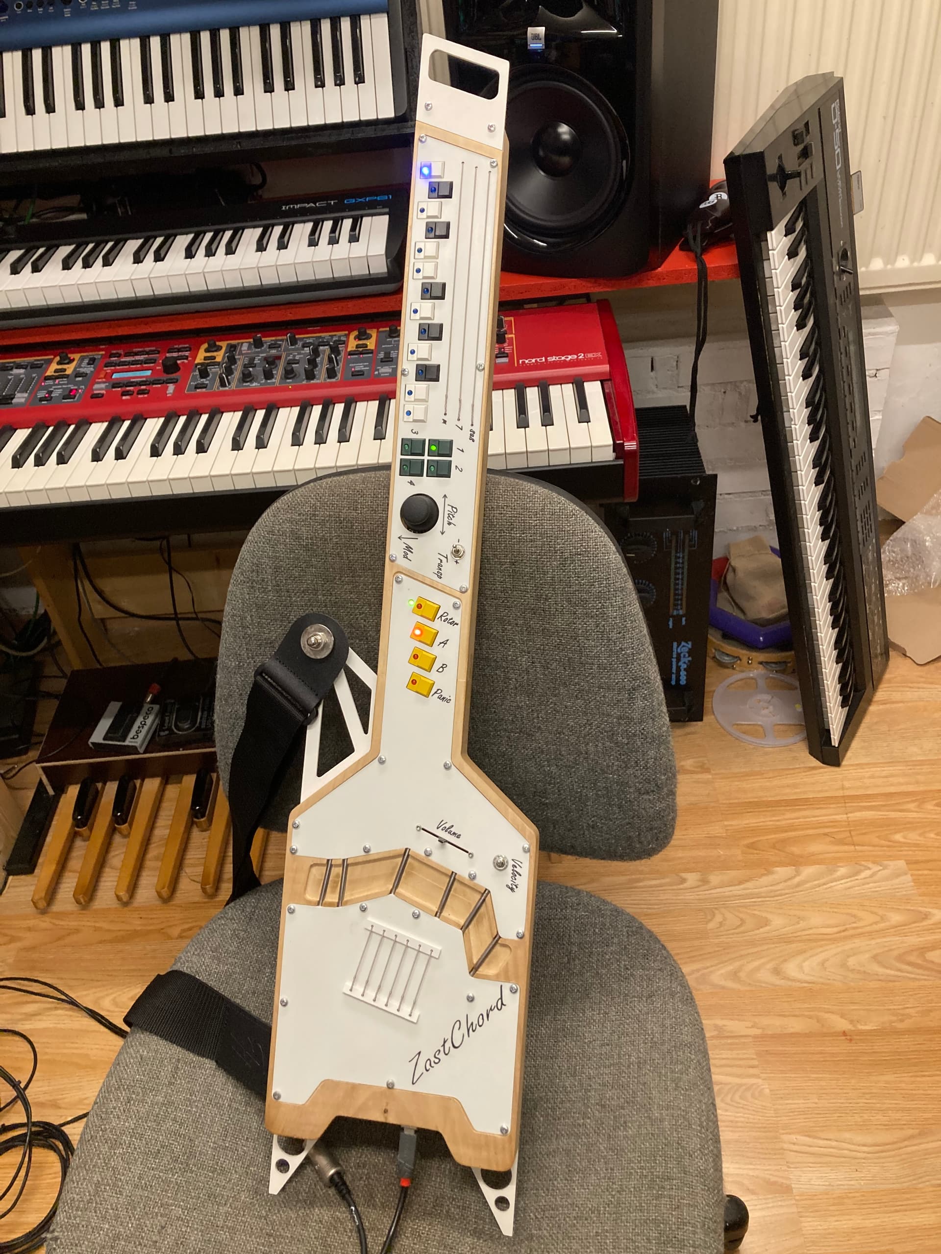 Hi, this is my “Zast Chord” a self designed chord beased Keytar. I´m a bit proud of it as I did almost all things by myself, designing and building corpus, doing the whole Software, develop circuit diagrams. Except the PCB´s, these were designed by my son based on my diagrams.