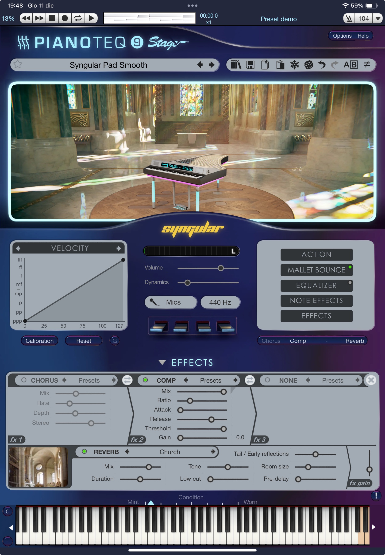 As with previous releases, I tested the piano synthesiser on a pro-grade hammer-action keyboard, using a slightly modified logarithmic velocity curve, which in general proved to suit my playing habits and sonic expectations better.