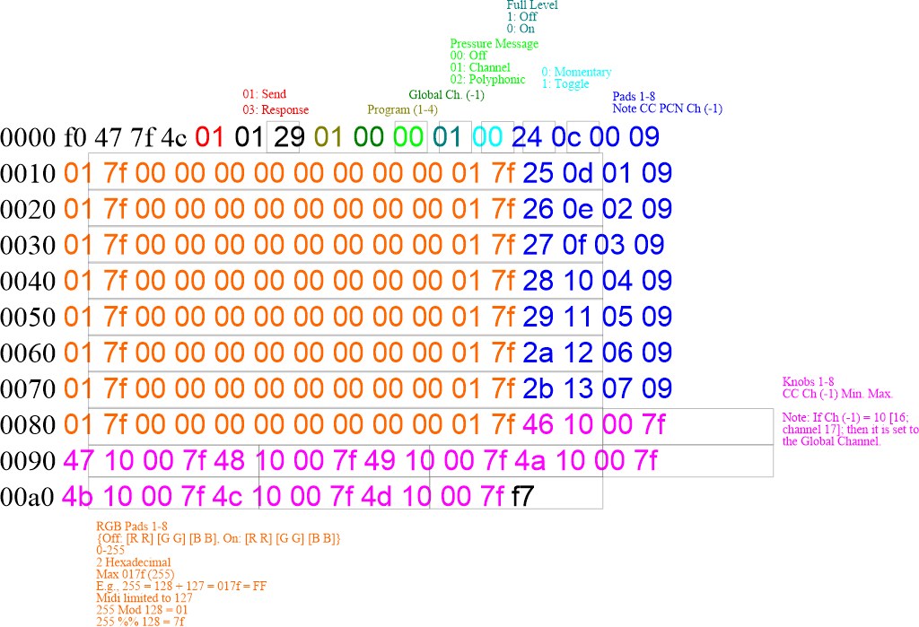 For this device and this situation I need the current device settings, and change them so the bottom 4 knobs are assigned the right CC values while the rest of the settings remain intact.