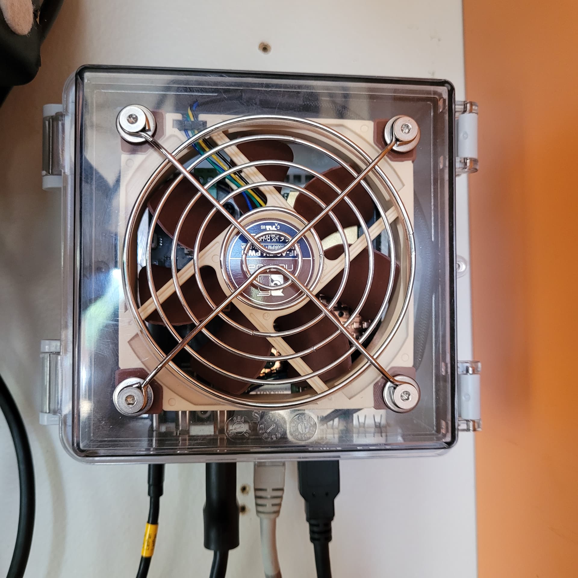 The unit is encased in this shell, size 131x130x75mm, Transparent cover, and cooled by a Noctua 5v PWM 92mm. The video out goes via HDMI to a split screen monitor that my PC is also connected to.