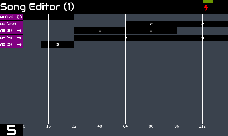- The song editor track titles now show: A1 (10,60) , where A is the group, 1 is the track number, 10 is the MIDI channel for playback, 60 is the MIDI note number for trigger and shows the play mode. Background colour alternates between purple and blue for odd and even groups.
