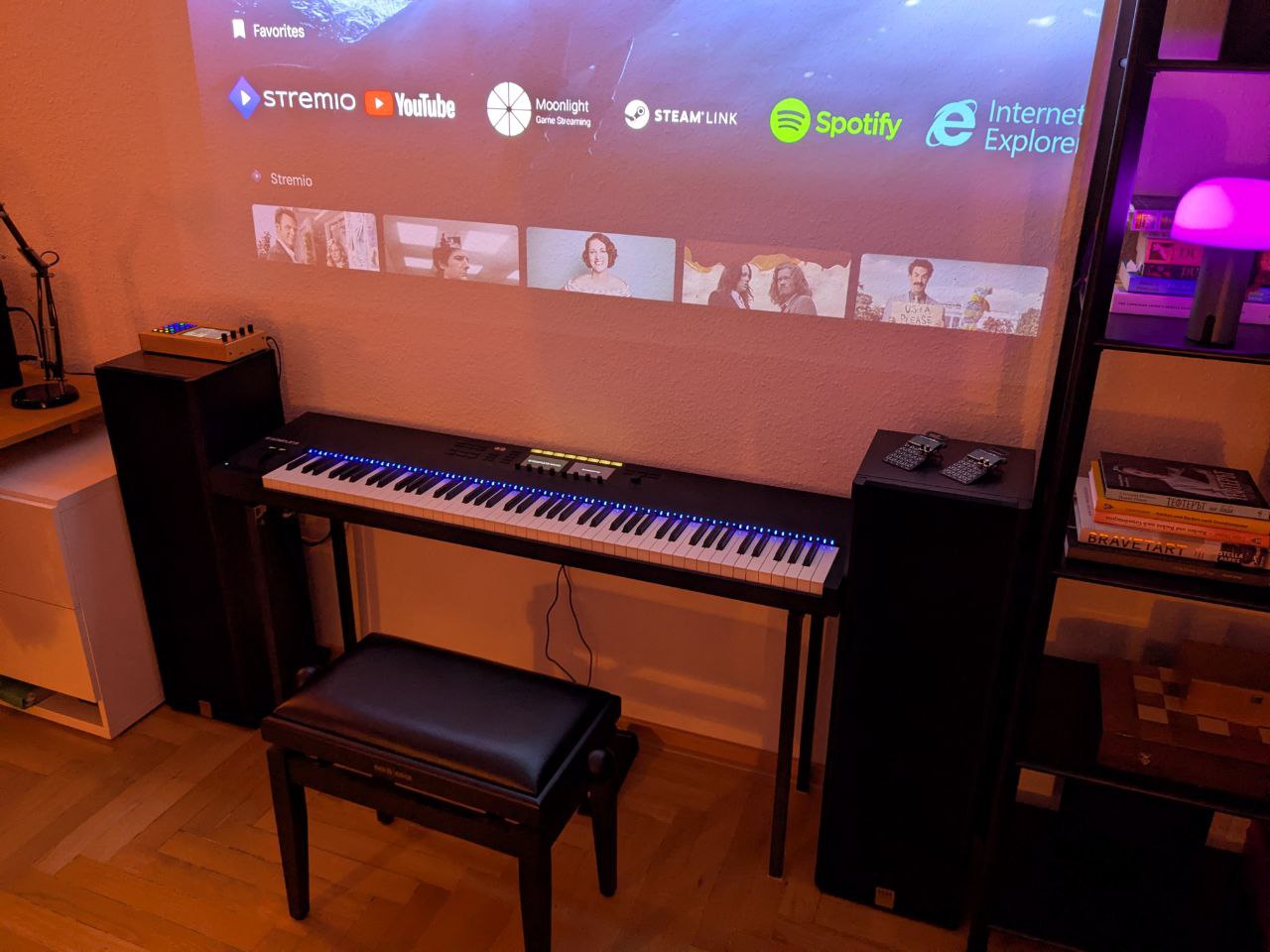 The stereo system is connected to the Zynthian V5. I usually have it running 24/7 and it allows me to turn on the S88 Mk2 Keyboard anytime and start playing.